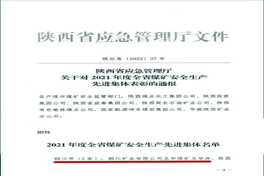 6月16日,從陜西省煤炭工業(yè)協(xié)會第四次會員代表大會暨四屆一次理事會上傳來喜訊,玉華煤礦被授予“2020—2021年度陜西省煤炭特級安全高效礦井”榮譽(yù),這是礦井繼榮獲“2021年度全省煤礦安全生產(chǎn)先進(jìn)集體”殊榮后的又一件大事喜事,見證全礦上下牢記安全發(fā)展初心,辛勤耕耘、擔(dān)當(dāng)作為,促進(jìn)安全高質(zhì)量發(fā)展的奮斗足跡。