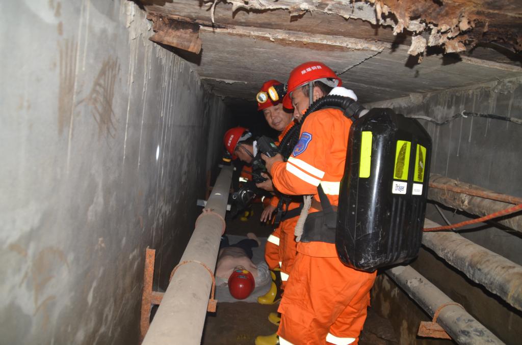 這是9月15日上午,公司礦山救護(hù)大隊開展有限空間作業(yè)事故救援實戰(zhàn)演練的畫面。 演練以某污水處理廠組織工人實施地下綜合管溝清淤作業(yè),未嚴(yán)格落實安全技術(shù)措施,因管道溝內(nèi)氧氣濃度不足,造成1名工人在進(jìn)入作業(yè)時缺氧窒息為背景,出動指戰(zhàn)員18人、救援車輛4臺、各類救援裝備30余臺套,設(shè)置有聞警出動、入井準(zhǔn)備、通風(fēng)供氧、氣體檢測、傷員救助、心肺復(fù)蘇等科目。演練地點設(shè)在礦山救護(hù)大隊園區(qū)地下綜合管溝。