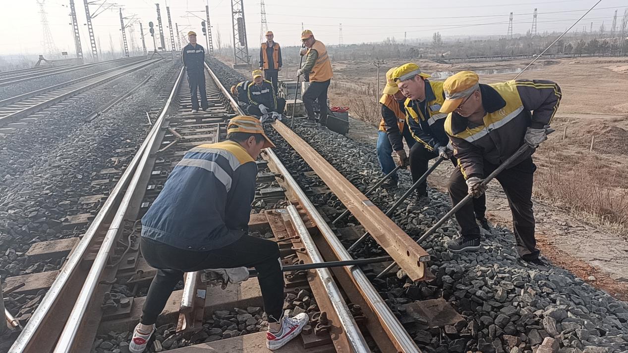 人勤春來早,實(shí)干正當(dāng)時。液化廠車站作為榆橫線路貨運(yùn)的大動脈,承擔(dān)著全年的運(yùn)輸量。因液化廠站1#道岔尖軌磨耗較為嚴(yán)重,達(dá)到重傷標(biāo)準(zhǔn),為保證行車安全,須立即進(jìn)行更換尖軌“手術(shù)”作業(yè)。隱患就是命令,榆橫項(xiàng)目部立即啟動換軌應(yīng)急程序。在工長的帶領(lǐng)下,全體人員協(xié)同分工,默契配合,換軌作業(yè)有條不紊地進(jìn)行,一鼓作氣將重傷尖軌更換完畢,最后由現(xiàn)場負(fù)責(zé)人對幾何尺寸進(jìn)行調(diào)整,確保軌道幾何尺寸良好,在經(jīng)過電務(wù)配合人員反復(fù)確認(rèn)檢查后,道岔各項(xiàng)指標(biāo)達(dá)到列車運(yùn)行標(biāo)準(zhǔn),軌道恢復(fù)通車條件,施工作業(yè)完畢。隨后,現(xiàn)場人員回收舊料,檢查零配件,翻倒舊尖軌并且撥到線路限界以外,做到“工完、料盡、場地清”。