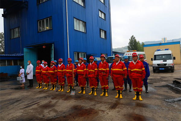 根據(jù)演練設(shè)定模擬險(xiǎn)情,該礦立即啟動(dòng)《汛期“三防”應(yīng)急預(yù)案》,地面指揮部統(tǒng)一指揮協(xié)調(diào)應(yīng)急救援工作??傊笓]發(fā)出集結(jié)指令,10分鐘之內(nèi),防汛應(yīng)急指揮部全體成員集結(jié)完畢,礦防汛搶險(xiǎn)小隊(duì)、駐礦救護(hù)中隊(duì)火速到達(dá)集合點(diǎn),應(yīng)急救援的技術(shù)、安全、醫(yī)療、保障、通訊等小組各自就位??傊笓]按照預(yù)案指定各專業(yè)救援小組和防汛搶險(xiǎn)各小隊(duì),立即趕赴災(zāi)情地點(diǎn),實(shí)施應(yīng)急處置。整體應(yīng)急搶險(xiǎn)救援分為兩步驟同時(shí)進(jìn)行,搶險(xiǎn)組出發(fā)趕往北風(fēng)井工業(yè)廣場(chǎng),在北斜井井口使用防汛專庫(kù)物資構(gòu)筑堅(jiān)實(shí)的防水墻,安裝應(yīng)急排水泵、連接排水管等進(jìn)行排水作業(yè),有效防止雨水倒灌。救援組在南風(fēng)井接應(yīng)井下撤離人員,并對(duì)升井人員進(jìn)行清點(diǎn)人數(shù),對(duì)身體不適人員進(jìn)行詢問檢查和醫(yī)療救治。經(jīng)過一個(gè)半小時(shí)的搶險(xiǎn)作業(yè),險(xiǎn)情得到有效處置,圓滿完成此次防汛搶險(xiǎn)演練。