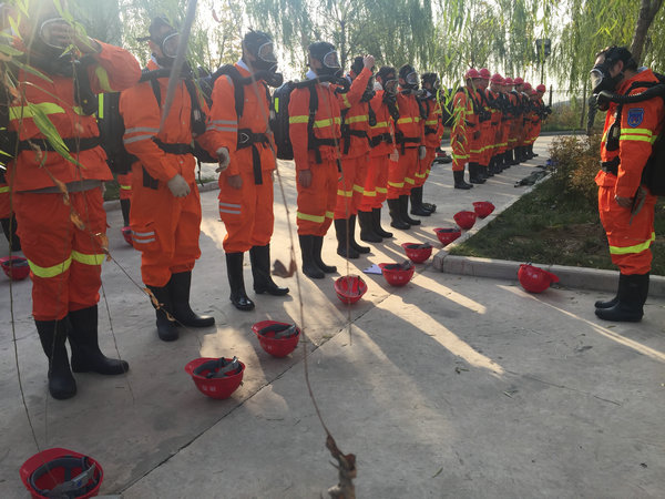 11月15日上午8時(shí)50分,一陣急促的警鈴聲響徹整個(gè)礦山救護(hù)大隊(duì)基地,瞬間在樓道、院內(nèi)都能聽(tīng)到急促的腳步聲,同時(shí)不時(shí)傳來(lái)指揮員下達(dá)命令的聲音,值備班車庫(kù)門打開(kāi),救援車輛啟動(dòng),全體指戰(zhàn)員迅速集結(jié)待命,整齊的報(bào)數(shù)聲不絕于耳,帶隊(duì)指揮介紹事故概況后下達(dá)了出發(fā)命令,市區(qū)中隊(duì)四輛救護(hù)車?yán)懢鸭柴Y而去……其余三個(gè)小隊(duì)迅速轉(zhuǎn)入值班狀態(tài),戰(zhàn)訓(xùn)、裝備、后勤保障等部門立即進(jìn)入戰(zhàn)備狀態(tài),做好隨時(shí)支援的準(zhǔn)備。一次以突發(fā)礦井事故為背景的應(yīng)急救援演練拉開(kāi)了序幕。