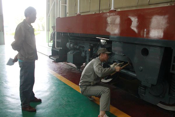趙佳、張凡、劉航、馮海麟等新學員身穿工作服,手持小鐵錘,拿著考核單,開始對機車電器、制動、柴油機、輔助間、走行部等模擬故障點進行檢查。