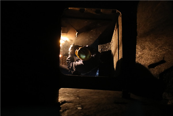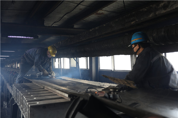 井巷中,傳來陣陣“一二、嘿喲……”的號(hào)子聲,打破了一片寧靜,機(jī)電車間職工抬起管路步伐有力堅(jiān)定。綜采隊(duì)職工迅速就位,按照技術(shù)要求拆卸裝置,一二部膠帶進(jìn)行合并。主斜井機(jī)尾處,運(yùn)轉(zhuǎn)隊(duì)職工為膠帶上夾板硫化9#接頭。南風(fēng)井儲(chǔ)水池內(nèi),職工穿上防水服疏通管路。螺旋篩倉里,職工正在使用氧焊修復(fù)襯板。一時(shí)間從井下到地面,檢修的旋律瞬間奏響。