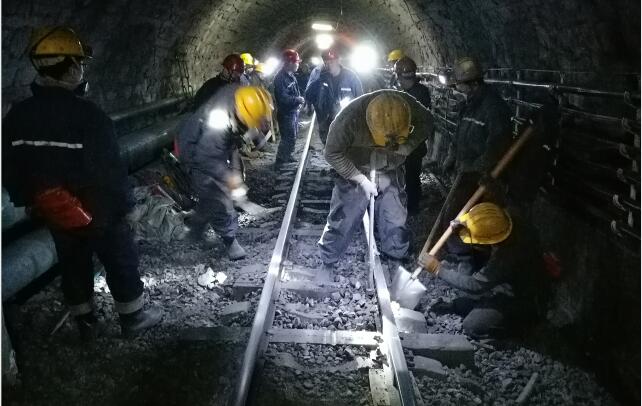 更換副絞鋼絲繩和副斜井軌道由機(jī)電隊(duì)組織施工,綜掘三隊(duì)配合共同完成,更換鋼絲繩期間,施工單位通過(guò)人力將舊鋼絲繩從副絞天輪上拆卸下來(lái),再將新鋼絲繩一頭竄入滾筒固定,另一頭與鉤頭合金巴士澆筑,完成鋼絲繩更換工作。更換副斜井軌道期間,施工單位嚴(yán)格按照行車不檢修的原則,將需要更換的軌道、軌枕、建筑材料提前放入施工地點(diǎn),待車輛發(fā)完后,組織檢修人員逐次副斜井井口變坡點(diǎn)、井口向下200米處、550米處施工段進(jìn)行施工,組織人力使用洋鎬、鐵鍬等工具調(diào)整道基、軌枕和軌道,并對(duì)其進(jìn)行固定,完成軌道更換工作。