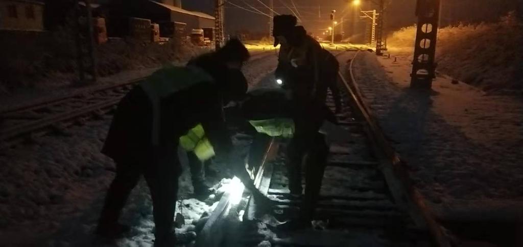 21日凌晨2:00,工電車間主任下達指令,各工區(qū)迅速組織工電人員拿著鐵锨、防凍液、吹雪機等除雪工具,對孟家壕車站、化工南車站、液化廠車站、轉水廟車站道岔進行掃雪作業(yè)。分別于2點和7點進行掃雪?!把┚褪敲?,無論是白天還是黑夜,雪不停、掃不止?!苯涍^作業(yè)人員的奮戰(zhàn),榆橫項目部管內共出