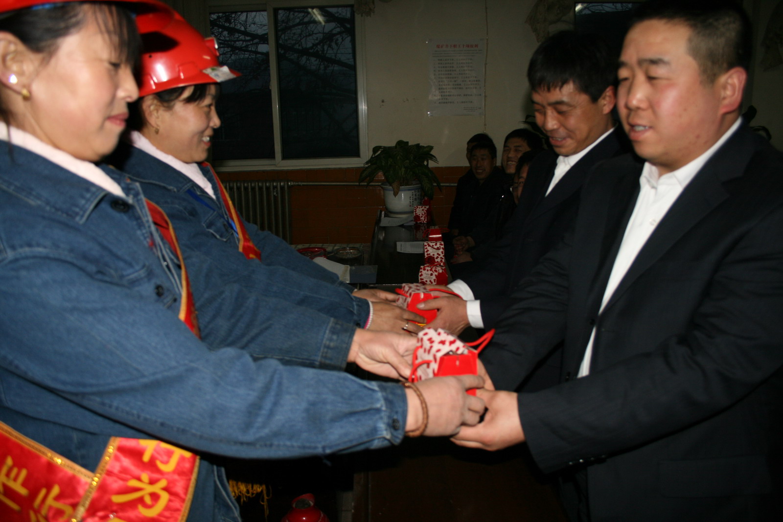 大年初一早7時30分,徐家溝公司各生產(chǎn)區(qū)隊上早班員工剛進行完班前安全禮儀,退管科黨支部組織的礦嫂安全服務隊的礦嫂們分組同時走進區(qū)隊學習室,給堅守生產(chǎn)崗位的員工拜年送溫馨。