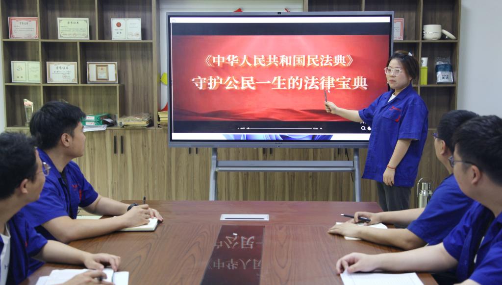 在公司機(jī)關(guān)黨員活動(dòng)室內(nèi),電子屏幕播放著公益宣傳片《中華人民共和國(guó)民法典》,該片通過宣介見義勇為免責(zé)、小區(qū)廣告收入歸業(yè)主、禁止高利貸、保護(hù)個(gè)人信息、界定夫妻共同債務(wù)、增加遺囑形式、明確高空拋物追償責(zé)任等七個(gè)方面內(nèi)容,涵蓋了日常生活各個(gè)方面,全面保護(hù)了公民的權(quán)利。隨后,法律宣傳員小陳結(jié)合實(shí)際案例,分析了企業(yè)在生產(chǎn)經(jīng)營(yíng)過程中可能遇到合同管理、知識(shí)產(chǎn)權(quán)等法律問題,為在坐職工進(jìn)行了講解,并倡導(dǎo)大家在工作中自覺守法,辦事依法、遇事找法、解決問題用法、化解矛盾靠法,為構(gòu)建和諧廠區(qū)筑牢法治根基。