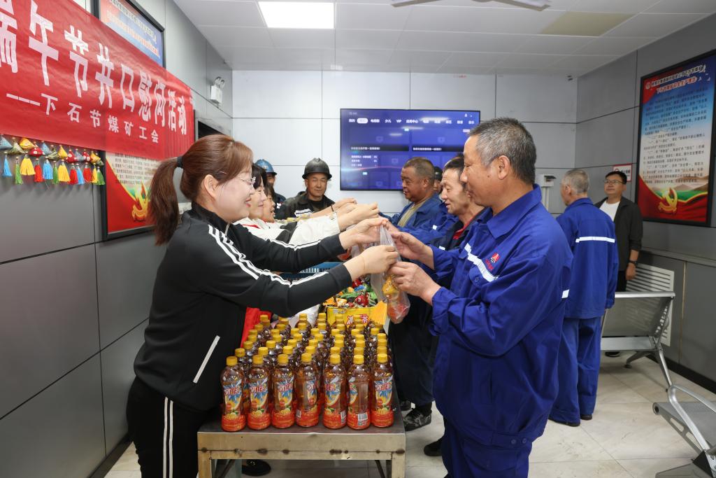 活動(dòng)現(xiàn)場,協(xié)管員們?cè)缭缇蛯Ⅳ兆印㈦u蛋、飲料、香包等慰問品整齊擺放,如同精心籌備的“安全驛站”。當(dāng)?shù)V工們頭戴安全帽、身披工裝踏入候車室,協(xié)管員們立即迎上前,雙手遞上慰問品:“師傅,吃個(gè)粽子,下井注意安全!”礦工們接過慰問品,紛紛表示:“在這特殊的日子里,能收到這份關(guān)懷,心里特別溫暖,我們一定牢記安全,決不辜負(fù)家人的期盼和企業(yè)的信任?!?/p>