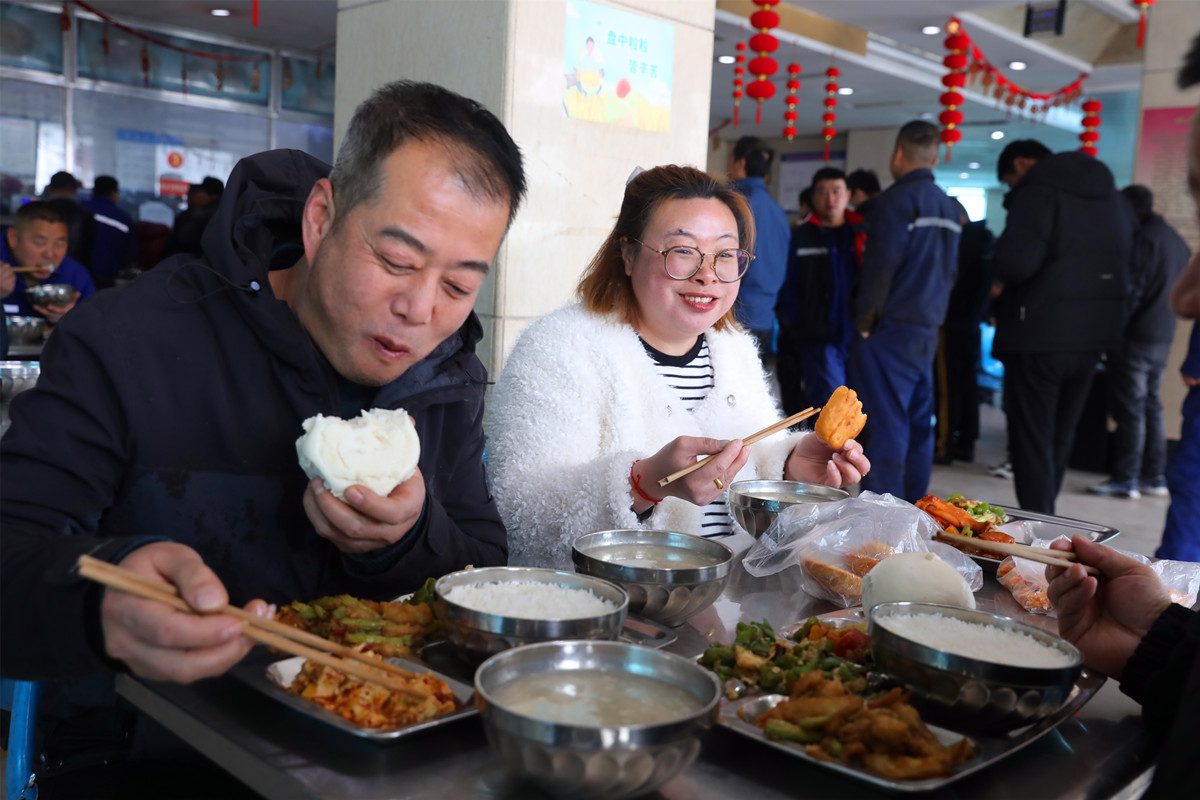 從熱氣騰騰的主食到風(fēng)味各異的配菜,從精心調(diào)制的湯羹到新鮮可口的水果,當(dāng)蒸碗、炸食、熱菜涼菜、水果湯羹端上餐桌,每一道菜品飽含著來自礦井對職工的新年祝福與安全叮囑。