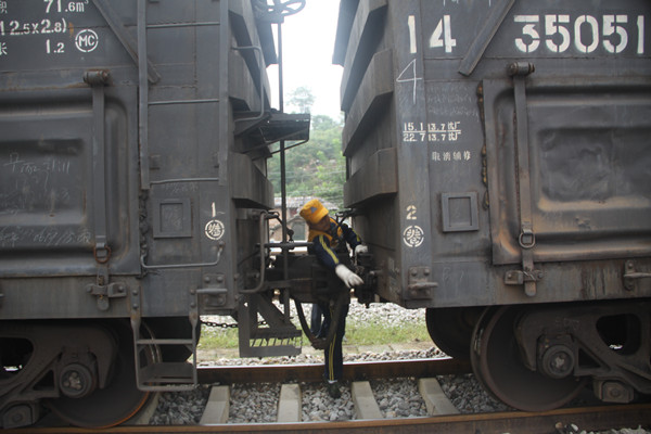 風(fēng)管是機(jī)車車輛的連接部分,起著供氣、制壓、緩解的作用,被譽(yù)為機(jī)車車輛的“氧吧”和“穴道”。在技術(shù)員李小紅、陳家山車站副站長(zhǎng)陳獻(xiàn)軍等人監(jiān)督下,每個(gè)調(diào)車員要按照“一關(guān)前、二觀后、三摘風(fēng)管、四提鉤”的要求,在指定的位置、規(guī)定的時(shí)間完成所有動(dòng)作。