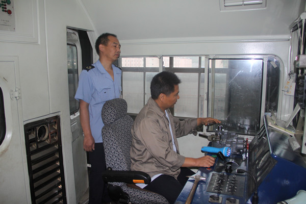 閆華林不管是在電器間、電機(jī)間、柴油機(jī)間、風(fēng)泵間、冷卻間等處都小心翼翼地對(duì)每個(gè)部件進(jìn)行檢查,只聽見他一會(huì)說“設(shè)備狀態(tài)良好”、一會(huì)說“ 安全性能穩(wěn)定”,并發(fā)現(xiàn)了一處漏油點(diǎn)。之后,他又來(lái)到了內(nèi)燃機(jī)車走行部對(duì)手扶桿、腳蹬、排斥器、閘瓦等一一進(jìn)行了檢查,在規(guī)定時(shí)間內(nèi)進(jìn)行完畢。