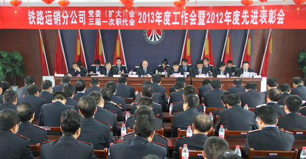 1月23日,鐵路運銷分公司黨委(擴大)會、三屆一次職代會、2013年度工作會暨2012年度先進表彰會在分公司二樓會議室勝利召開,分公司副總以上領導、機關部門負責人、基層單位領導、職工代表共計130余人參加了會議。