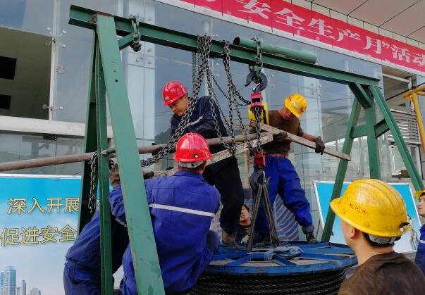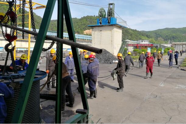 該項目部合理組織,利用一個小班時間,對副斜井1200米鋼絲繩進行更換。為不影響職工上下班,機電部已提前準備好鋼絲繩更換所需材料,機電隊已完成了鋼絲繩的鉤頭制作,并組織職工學習《更換副絞放鋼絲繩安全技術(shù)措施》,使職工掌握安全要領(lǐng)。鋼絲繩更換采取拖輪倒繩的方式進行,在鋼絲繩的放繩、換繩、串繩、卡繩的每一個環(huán)節(jié),設(shè)專人指揮,保證了換繩現(xiàn)場安全進行。經(jīng)過近4個小時的努力,在空載、重載試驗后,運行參數(shù)符合安全標準,可以投入正常使用,至此,鋼絲繩更換工作順利完成,進一步確保了副斜井提升安全。