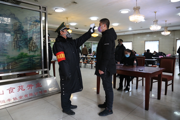 “各位師傅們,請(qǐng)保持1米以上的距離,依次進(jìn)行體溫測量,有序進(jìn)入?!痹缟?點(diǎn),在該礦職工食堂大門口,就聽見執(zhí)勤的救護(hù)隊(duì)隊(duì)員不停地喊著。以前密集排隊(duì)就餐、圍坐在餐桌上吃飯聊天的場景不見了,取而代之的是就餐職工經(jīng)過體溫測量,間隔排隊(duì)打飯后,單人單桌,互不照面的就餐習(xí)慣。