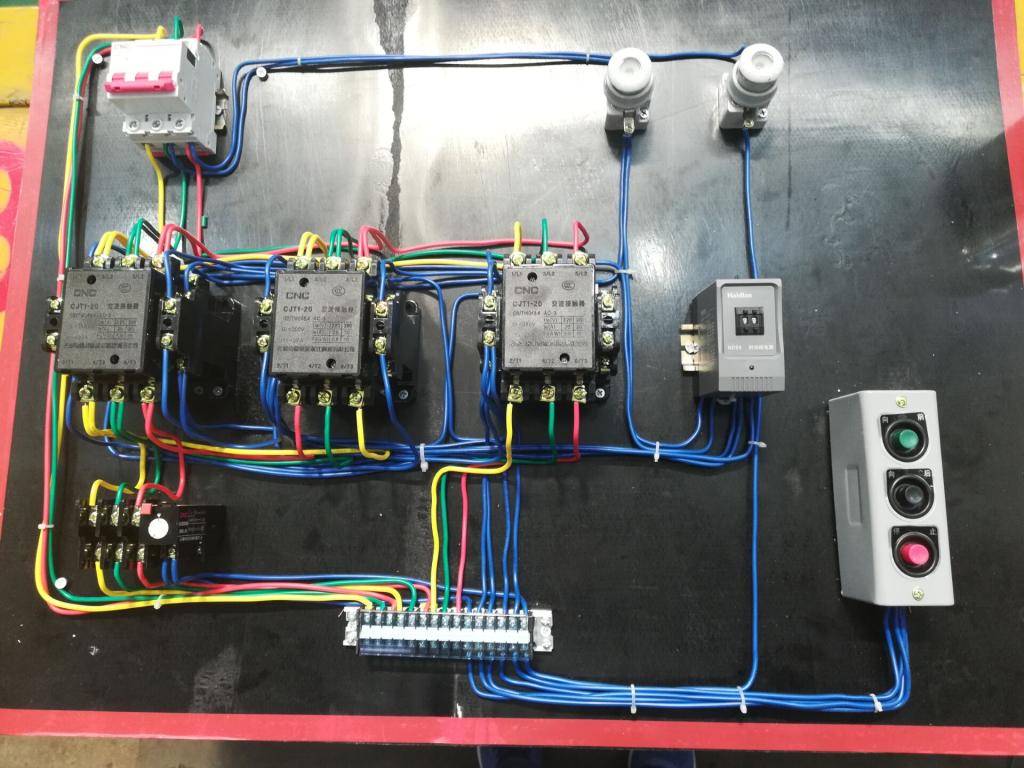 7月30日上午,實操比賽開始了,題目是根據(jù)電路圖在配電盤上實現(xiàn)電機(jī)順序啟動延時正反轉(zhuǎn)功能。