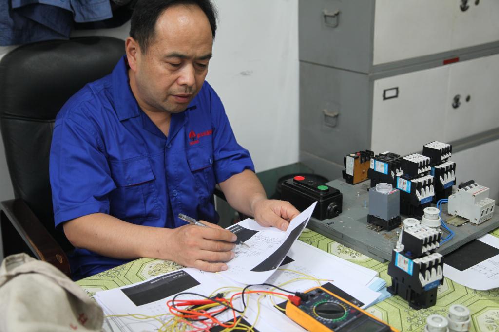 肖建峰干脆放下手中工具,張開雙臂扭了扭腰,讓緊張的情緒逐漸平復(fù)。再一次仔細(xì)看看圖紙,保證每一步精準(zhǔn)到位,一會斜口鉗、一會剝線鉗,最終配電盤接線準(zhǔn)確橫平豎直......