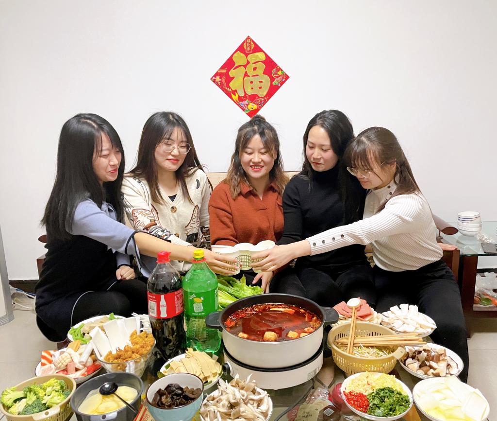 李穎:“媽,過(guò)年好呀!你看,我們這里可熱鬧了,我們幾個(gè)家在外地的女生聚在一起過(guò)年呢……”