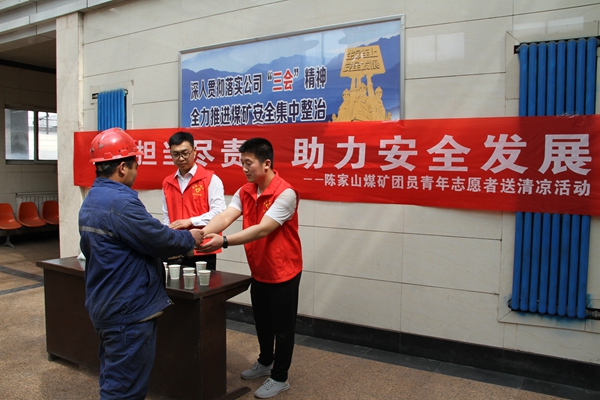 為推進(jìn)黨史學(xué)習(xí)教育走深走實(shí),持續(xù)把“我為群眾辦實(shí)事”實(shí)踐活動抓到細(xì)處,近日,陳家山礦團(tuán)委以“安全生產(chǎn)月”活動為契機(jī),舉辦“青年擔(dān)當(dāng)盡責(zé) 助力安全發(fā)展”團(tuán)員青年志愿者送清涼活動,通過對奮戰(zhàn)在高溫天氣的干部職工一聲感謝、送一份清涼,把溫暖送到心坎,把安全帶到身邊,推動礦井高質(zhì)量發(fā)展。