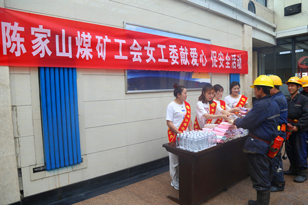 6月10日,陳家山煤礦工會(huì)女工委在井口開展“獻(xiàn)愛心 促安全”活動(dòng),為奮戰(zhàn)在井下一線的職工系上“一生平安”安全帶。
