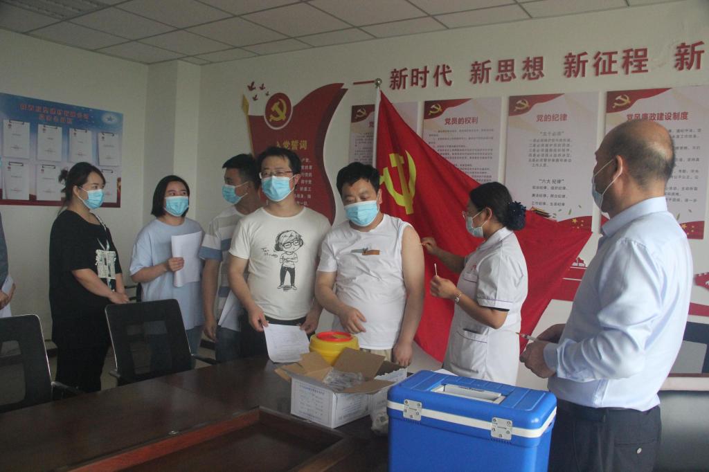 在該公司黨員活動(dòng)室,來(lái)自錦繡園社區(qū)衛(wèi)生服務(wù)中心的醫(yī)務(wù)人員緊張忙碌著,職工佩戴著口罩,有序排起長(zhǎng)隊(duì),等候接種新冠疫苗。