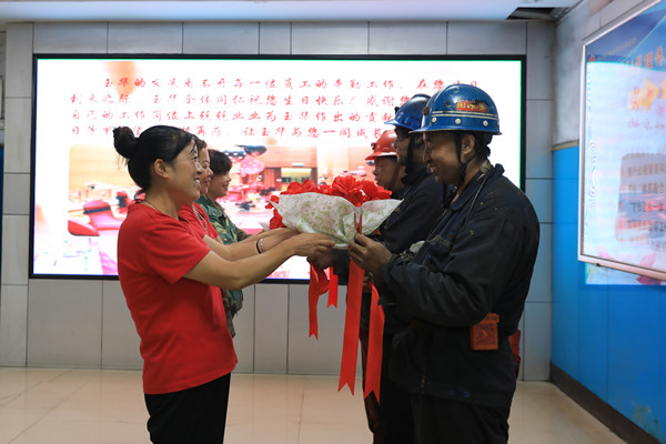 8月16日,眾人合唱的生日歌回蕩在玉華煤礦候罐大廳內(nèi),電子屏幕上正在播放一則生日祝福微視頻,手捧甜美的生日蛋糕、艷麗的鮮花,張文革、武三喜、王西寧、蔡樂、高衛(wèi)紅和唐建榮等6名同志,成為這場(chǎng)特殊慶生會(huì)的第一批幸運(yùn)兒,收到了駐足圍觀的工友深深祝福。