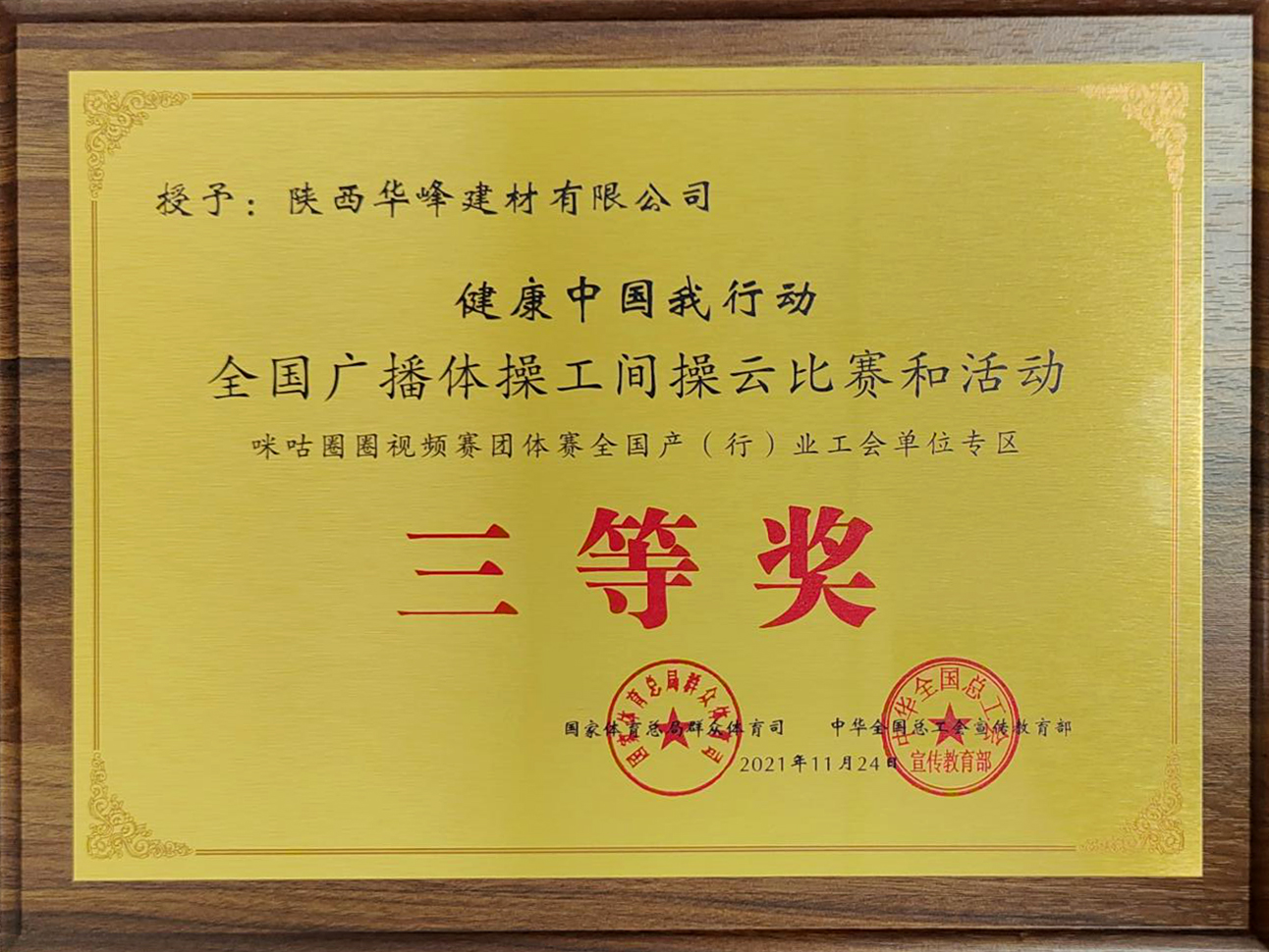 日前,華峰公司在“健康中國我行動”全國廣播體操工間操云比賽和活動中,獲得咪咕圈圈視頻賽團(tuán)體賽全國產(chǎn)(行)業(yè)工會單位專區(qū)三等獎。此次比賽是在中華人民共和國第一套廣播體操頒布70周年之際,由國家體育總局群眾體育司、中華全國總工會宣傳教育部主辦,全國四大專區(qū)共有200多萬職工群眾參賽。