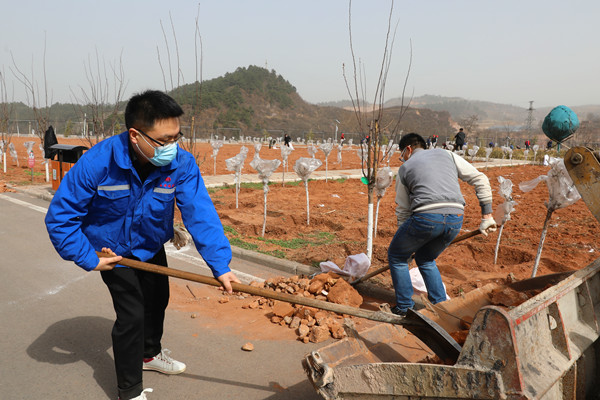 三月沐風(fēng),礦山凝云。3月14日下午,玉華煤礦黨員干部及青年志愿者帶頭走進(jìn)北風(fēng)井綠植區(qū),除雜草、撿石塊,給景觀樹(shù)木脫去“冬裝”,用勞動(dòng)美為春光平添一抹新綠。