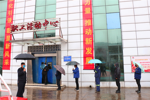 “請大家準備好核酸預(yù)約碼,戴好口罩,保持安全間隔距離,有序排隊行進”。3月16日一早,玉華煤礦全體動員進行全員核酸檢測,醫(yī)護人員、志愿青年和全礦干部職工風雨兼程,攜手共同擔起戰(zhàn)“疫”責任。