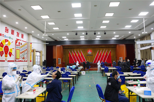 同時,青年志愿者宣傳引導(dǎo)職工正確、快速填寫預(yù)約碼登記信息,快速配合采樣檢測。保衛(wèi)部門維護秩序,防止檢測前后人員聚集?;鶎訂挝话凑諜z測工作要求,錯時分批組織職工前往檢測點。10余名醫(yī)務(wù)人員共設(shè)立3個采樣臺,對前來采樣的職工分流依次檢測,醫(yī)務(wù)人員嫻熟、嚴謹?shù)闹貜?fù)著取拭子、采樣、裝試管等一系列動作,快速高效完成核酸檢測工作。