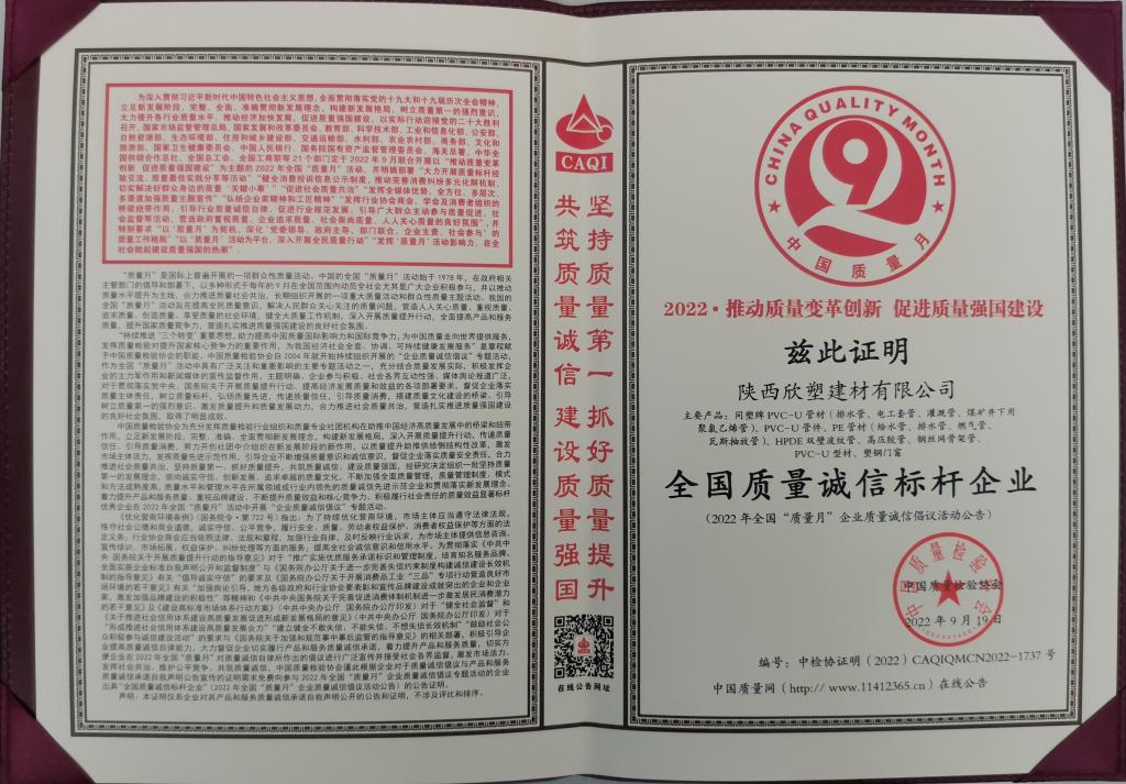 近日,在中國質(zhì)量檢驗(yàn)協(xié)會組織開展的2022年全國“質(zhì)量月”企業(yè)質(zhì)量誠信倡議專題活動(dòng)中,欣塑公司憑借過硬的產(chǎn)品質(zhì)量,良好的誠信服務(wù),榮獲了“全國質(zhì)量誠信標(biāo)桿企業(yè)”榮譽(yù)稱號。