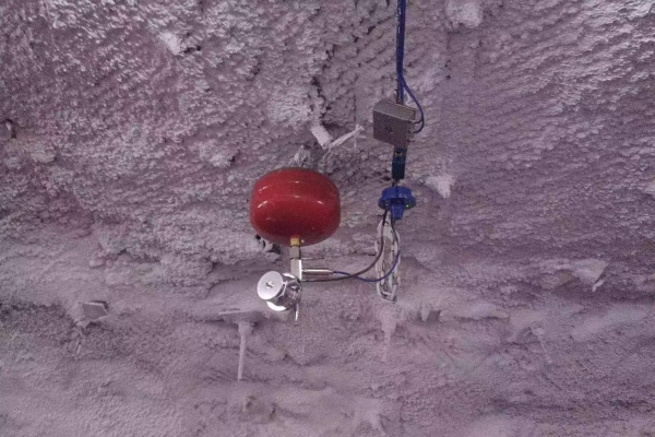 該礦此次投用的煤礦區(qū)域火災(zāi)預(yù)警及自動滅火系統(tǒng),主要由地面工作站(含監(jiān)控軟件)、控制主機(jī)、光纖測溫主機(jī)、火焰?zhèn)鞲衅鳌熿F傳感器、語音聲光報(bào)警器、疏散指示燈、干粉滅火裝置、氣體滅火裝置等組成,涵蓋了火災(zāi)探測預(yù)警報(bào)警系統(tǒng)、光纖測溫系統(tǒng)、自動滅火系統(tǒng)、安全疏散系統(tǒng)的功能。通過在線監(jiān)測監(jiān)控能夠在地面工作站全面掌控井下地面該自動滅火系統(tǒng)的運(yùn)行狀況、查詢報(bào)警信息等,全線溫度實(shí)時(shí)監(jiān)測,在火災(zāi)發(fā)生前發(fā)出預(yù)警。