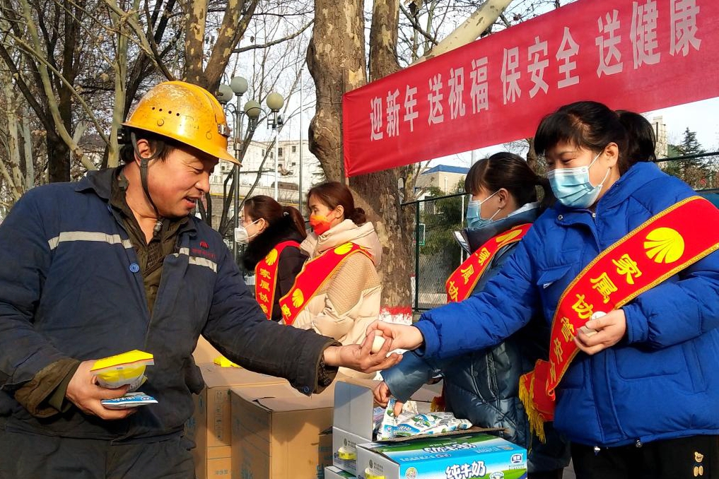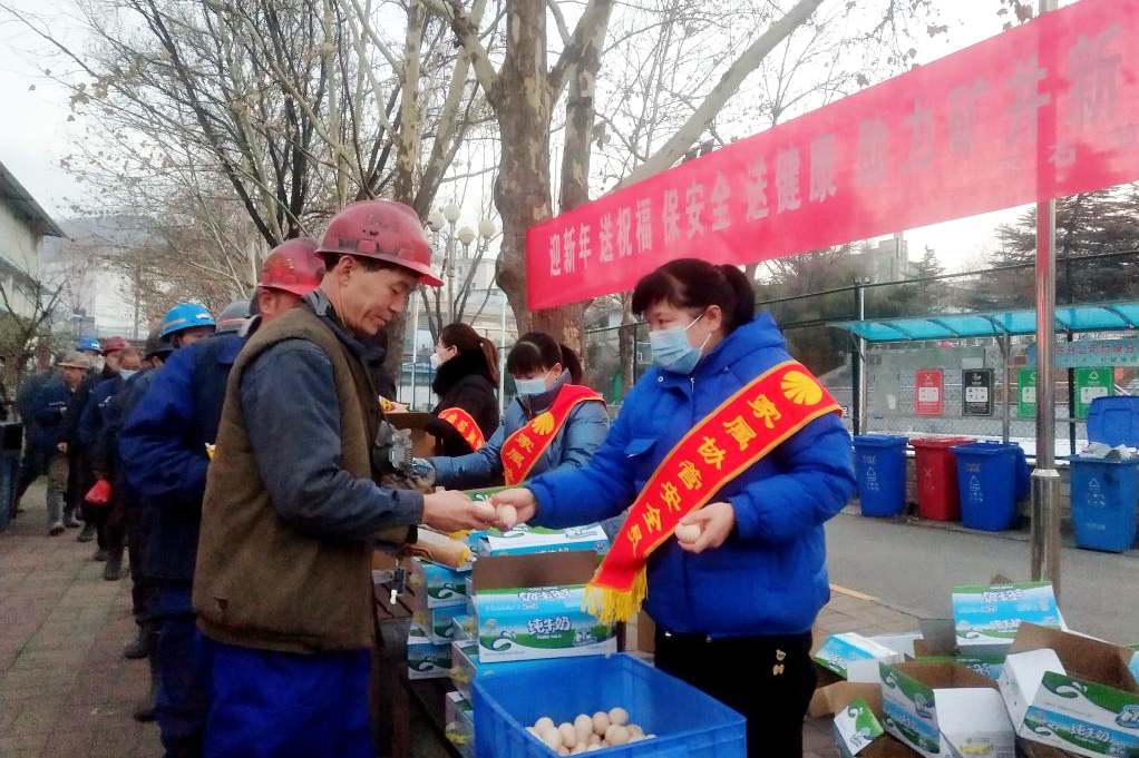 活動(dòng)現(xiàn)場(chǎng),女工家屬們?yōu)楣?jié)日期間仍堅(jiān)守在工作崗位的礦工兄弟送上了面包、雞蛋、純奶等節(jié)日禮品,同時(shí)祝福工友們新年快樂(lè),平安幸福,叮囑他們?yōu)榱说V井的安全發(fā)展和家庭的幸福美滿,在工作中時(shí)刻注意安全,聽(tīng)從指揮,杜絕違章,高高興興上班,平平安安回家。