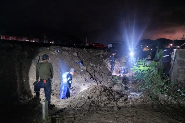 搶修過程中,按照職責(zé)分工忙碌不停,搶修現(xiàn)場爭分奪秒,各項工作緊張有序地進行著。機電部負責(zé)現(xiàn)場指導(dǎo),安全監(jiān)察部負責(zé)現(xiàn)場安全監(jiān)管以及河水的水位監(jiān)測,保證施工人員安全,機電隊、綜掘三隊共30余人由隊長帶領(lǐng)在河道里挖基坑固定地錨,機電車間人員迅速將沙子、水泥等材料通過叉車、卡車運至橋頭,然后人工運送到施工現(xiàn)場。