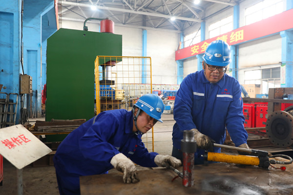 該礦機加工車間職工岳永軍,依靠多年加工器具的工作經驗,提出了通過液壓系統(tǒng)產生壓力來完成拆卸工作的思路,通過精心設計、反復試驗,并不斷優(yōu)化改進,打造出一款專用扒具。在拆除耦合器時,將扒具的接口連接到液壓泵上,扒具口對準需要拆除的零部件卡口位置,打開液壓系統(tǒng)開關,液壓油進入扒具油缸,扒具收縮產生強大拉力,從而能夠依靠機械力輕松拆除零部件。