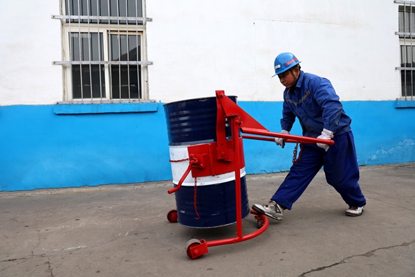 該礦機(jī)電車(chē)間作為礦井設(shè)備維修、機(jī)加工、供電供水供暖的保障單位,機(jī)油、柴油、抗磨油等油料用于設(shè)備清洗、潤(rùn)滑以及齒輪和軸承加油,使用頻繁,搬運(yùn)和傾倒沉重的油桶不僅是個(gè)重體力活,需要三四個(gè)人協(xié)作,而且費(fèi)時(shí)費(fèi)力。為有效解決這一難題,機(jī)電車(chē)間副主任楊嘉棟、班長(zhǎng)李俊喜帶領(lǐng)業(yè)務(wù)骨干人員利用業(yè)余時(shí)間開(kāi)展技術(shù)攻堅(jiān),巧妙利用杠桿原理達(dá)到重物搬移輕便高效的目的,結(jié)合油桶高低確定力臂長(zhǎng)短與裝置高度,利用定向輪和萬(wàn)向輪組合實(shí)現(xiàn)搬移與轉(zhuǎn)向自由有度。通過(guò)不斷優(yōu)化調(diào)整設(shè)計(jì)達(dá)到最佳效果后,進(jìn)行下料加工制作,投入實(shí)操應(yīng)用效果良好。