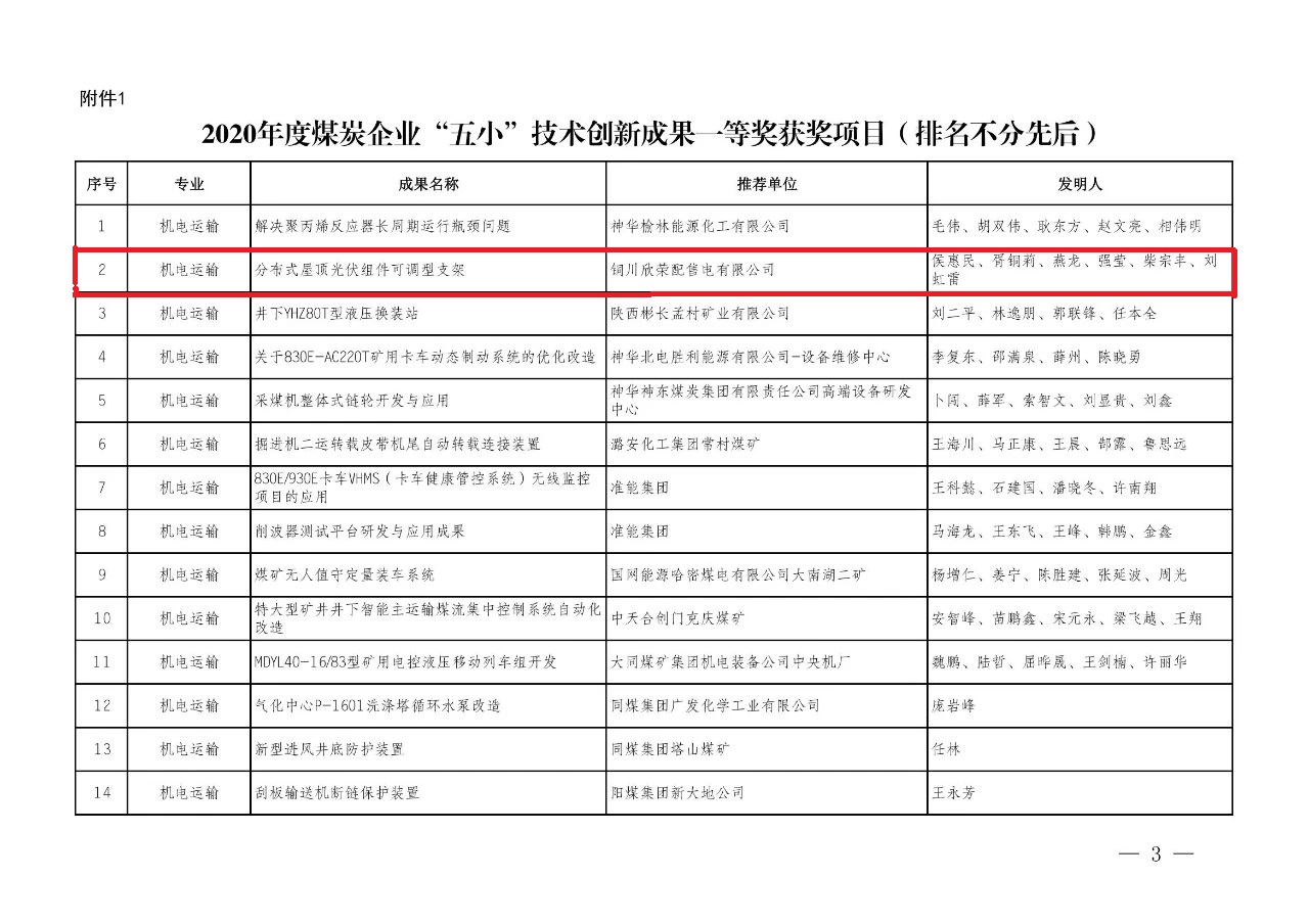 近日,中國煤炭工業(yè)協(xié)會公布了2020年度煤炭企業(yè)優(yōu)秀“五小”創(chuàng)新成果及征集活動優(yōu)秀組織獎,欣榮配售電有限公司兩項職工技術(shù)創(chuàng)新成果上榜,《分布式屋頂光伏組件可調(diào)型支架》榮獲2020年度煤炭企業(yè)“五小”技術(shù)創(chuàng)新成果一等獎;《下焦進線開關(guān)防雷保護》榮獲2020年度煤炭企業(yè)“五小”技術(shù)創(chuàng)新成果二等獎。