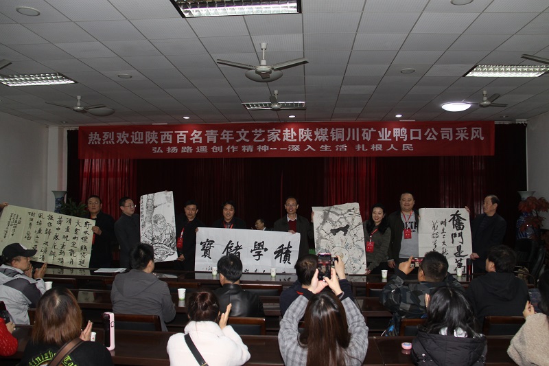在講解員聲情并茂的講解下,青年文藝家切身感受到這里,就是路遙文學(xué)名著《平凡的世界》中大牙灣煤礦的原型。大家懷著敬仰的心情,觀看了展館內(nèi)路遙與礦工交流的感人照片和遺留下的珍貴實(shí)物,了解了路遙不平凡的人生經(jīng)歷,聆聽了路遙創(chuàng)作文學(xué)名著《平凡的世界》在鴨口公司下井體驗(yàn)生活,化身一名真正的礦工,深入工作面和礦工一起勞作的故事,感悟了路遙“像牛一樣勞動(dòng)、像土地一樣奉獻(xiàn)”的精神。同時(shí),青年藝術(shù)家還見到了《平凡的世界》原型安鎖子本人,聆聽了安鎖子講述自己和路遙之間的故事。參觀結(jié)束,青年文藝工作者在鴨口公司調(diào)度會(huì)議室進(jìn)行了座談,由該公司負(fù)責(zé)人和《銅川礦工報(bào)》原編輯楊智華為大家講述了路遙當(dāng)年創(chuàng)作《平凡的世界》背后的故事,座談會(huì)上青年書畫家還向鴨口路遙文化館贈(zèng)送書畫作品。