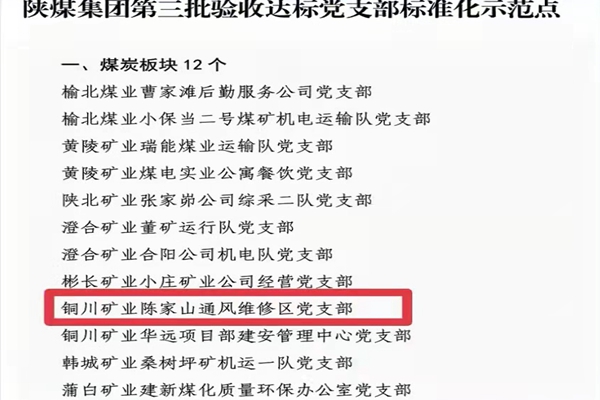 近日,陜煤集團(tuán)黨委下發(fā)文件,公布了第三批驗(yàn)收達(dá)標(biāo)黨支部標(biāo)準(zhǔn)化示范點(diǎn),陳家山煤礦通風(fēng)維修區(qū)黨支部榜上有名,被確定為陜煤集團(tuán)第三批“黨支部標(biāo)準(zhǔn)化示范點(diǎn)”稱號。