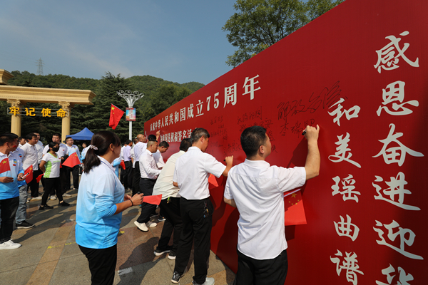 演出結(jié)束后,現(xiàn)場(chǎng)的演職人員與觀眾一同在印有“感恩奮進(jìn)迎華誕 勇立潮頭譜新篇”字樣的簽字臺(tái)前抒發(fā)了自己對(duì)祖國(guó)的美好祝福,并簽下了自己的名字。