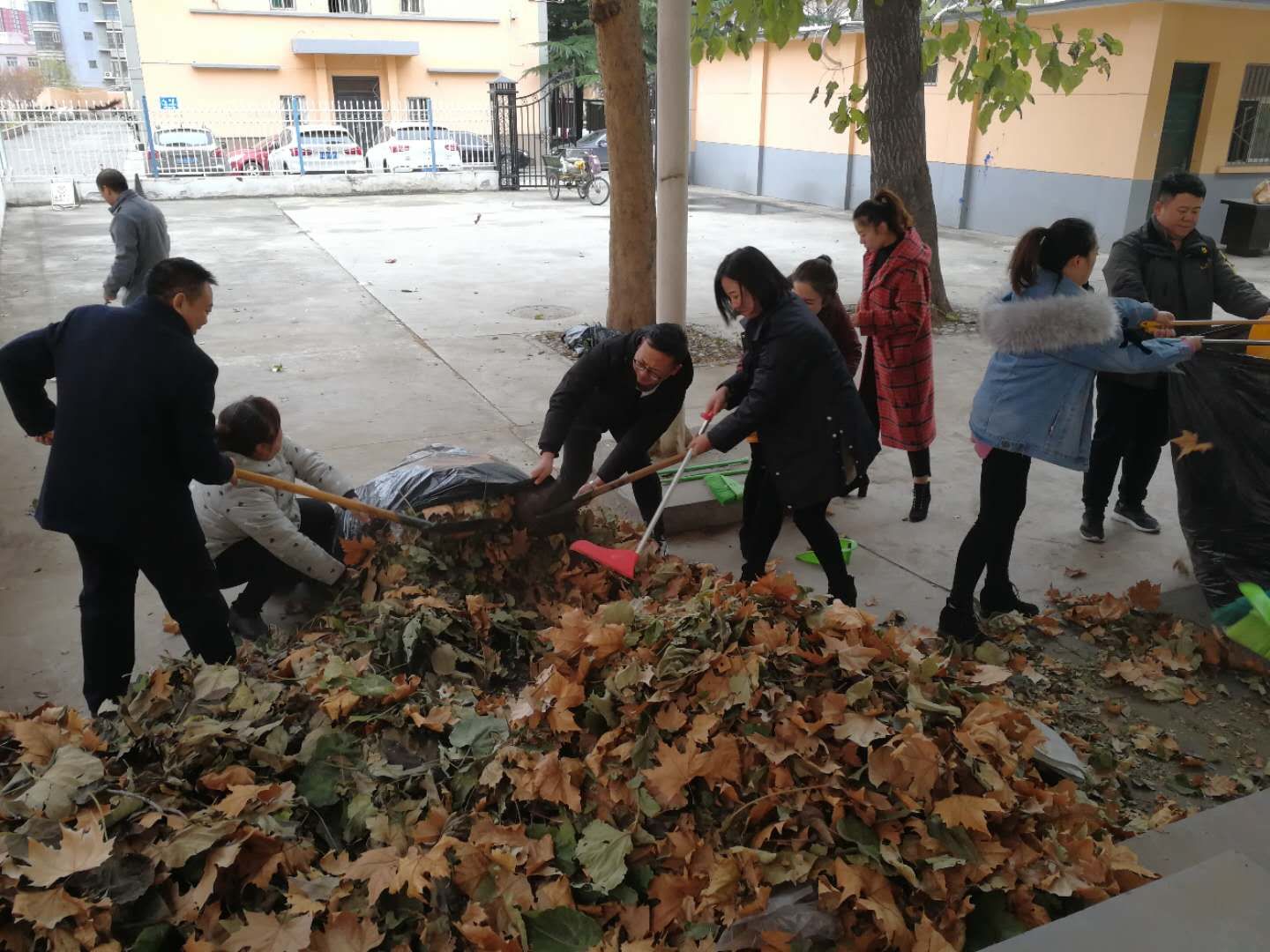 面對(duì)厚厚的一層樹葉,大家有的拿起掃帚掃起來(lái),有的拿起鐵锨鏟起來(lái),幾個(gè)人合力集中了一堆堆樹葉。黨員們你撐袋子來(lái)我來(lái)裝,用鐵锨裝了幾大袋子樹葉,將樹葉打包存放到制定地點(diǎn),不一會(huì)兒就清理干凈了場(chǎng)內(nèi)的樹葉。