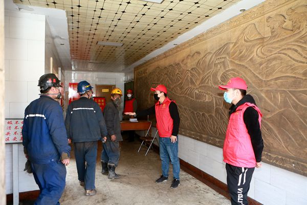 “師傅,您再往后面來一點(diǎn),說話時(shí)要保持1.5米以上距離;工作期間請(qǐng)將口罩佩戴好?!惫?yīng)科團(tuán)支部書記張君和青年團(tuán)員來到井口,溫馨提示廣大職工積極做好個(gè)人防疫。