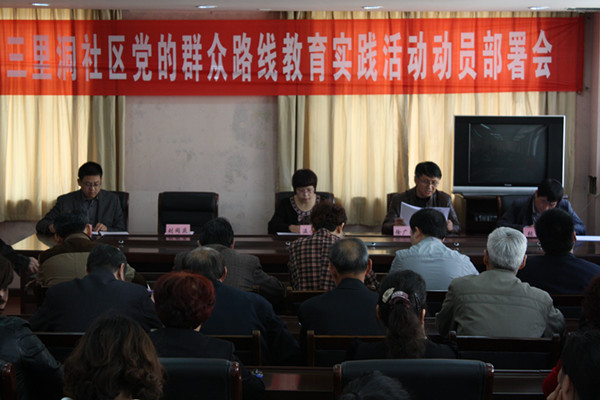 三里洞社區(qū)總支書記徐廣陽根據(jù)社區(qū)實際情況作了動員講話。他強調(diào)了開展黨的群眾路線教育實踐活動的必要性和重要性,以及活動的主要內(nèi)容和任務(wù)。他要求,社區(qū)黨員干部應(yīng)迅速統(tǒng)一思想,以黨的十八大和十八屆三中全會精神為指導(dǎo),牢牢把握“照鏡子、正衣冠、洗洗澡、治治病”的總要求,按照實業(yè)公司要求,規(guī)定動作不折不扣,切實查找好社區(qū)黨員干部中存在的“四風”問題,為解決實際問題打好基礎(chǔ)。同時,充分結(jié)合社區(qū)實際,緊緊圍繞存在的突出問題,將自選動作做精彩,扎扎實實完成教育實踐活動各項任務(wù)。