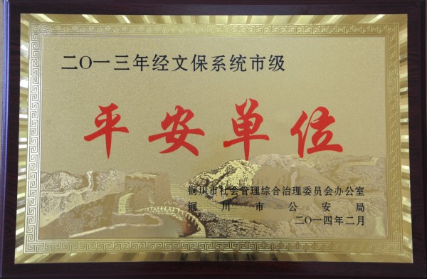 近日,銅川市社會管理綜合治理委員會辦公室、銅川市公安局聯(lián)合授予陳家山煤礦2013年度全市經(jīng)文保系統(tǒng)“平安單位”榮譽稱號。