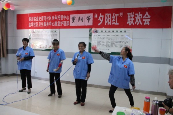 銅川實(shí)業(yè)史家河社區(qū)管理中心副主任李選來(lái)和職業(yè)病防治院書(shū)記楊瑞輝分別發(fā)言,為托管中心的老年朋友們獻(xiàn)上最真摯的節(jié)日祝福。聯(lián)歡會(huì)在歡樂(lè)的氣氛中由康復(fù)中心的護(hù)士們以舞蹈《向陽(yáng)花》拉開(kāi)帷幕,歌曲、太極拳、健身操、三句半、秦腔等十余個(gè)節(jié)目精彩紛呈。托管中心的老人和護(hù)士演唱了《南泥灣》和《北京的金山上》,聯(lián)歡會(huì)在老人們《紅歌聯(lián)唱》的合唱中落下了帷幕。會(huì)后,為老年人合影留念,祝愿老年朋友們幸福健康。