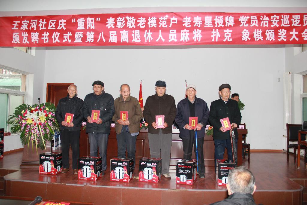 王家河社區(qū)主任張學(xué)海代表社區(qū)全體員工對(duì)敬老模范戶(hù)、老壽星們表達(dá)了親切的問(wèn)候和衷心的祝愿。希望年輕一代永遠(yuǎn)學(xué)習(xí)老一輩的閱歷和經(jīng)驗(yàn),為創(chuàng)和諧社區(qū)邁上新的臺(tái)階。同時(shí),會(huì)上對(duì)8戶(hù)“敬老模范戶(hù)”、13名“老壽星”及社區(qū)義務(wù)治安巡邏隊(duì)進(jìn)行了表彰。并為第八屆退休職工棋牌賽三個(gè)地區(qū)的前三名分別頒發(fā)聘書(shū)及頒獎(jiǎng)儀式。