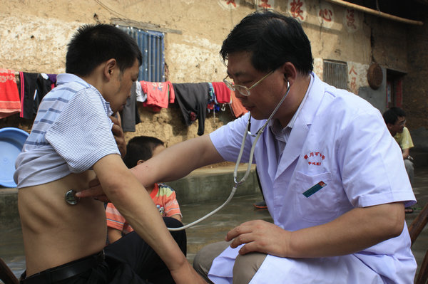 將近7點時,終于走到了厙發(fā)學家里,顧不上休息,趙青瓊開始為厙發(fā)學檢查身體。檢查中,趙青瓊發(fā)現(xiàn),厙發(fā)學是塵肺病Ⅲ期重癥患者,已出現(xiàn)心臟衰竭和呼吸衰竭??吹匠钊轁M面的厙發(fā)學,趙青瓊安慰他:“一定先按我說的方案進行治療,等你病情好轉(zhuǎn)后我會盡快安排你去醫(yī)院進行治療。錢的事你就不用發(fā)愁了。”厙發(fā)學看著趙青瓊,用力的點了點頭。短暫的體檢與交流后,趙青瓊和同事們便趕緊往回衛(wèi)生院的路上趕,8點之后,他們還有大量的工作要做?;貋淼穆飞?,趙青瓊一直拖著那只壞了的涼鞋艱難趕路,但想到厙發(fā)學不久將能進入中央財政撥款首批被救助的名單里,覺得爛著腳走完這20多里的山路值了!趁著途中休息,他發(fā)了一條微博:“天剛亮雨就停了,旬陽的山更綠了,又可以體檢更多的患者,好像老天爺也在獻愛心?!?/p>