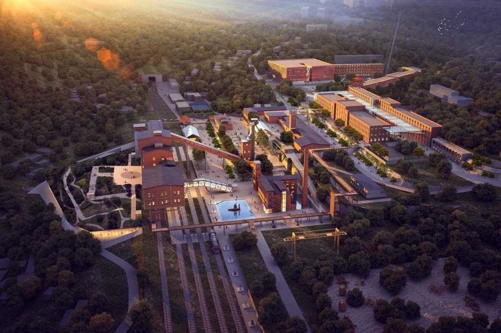 傲北凹地,起長虹,山石行云秀色。老礦風(fēng)貌今又見,半邊樓臺亭閣。