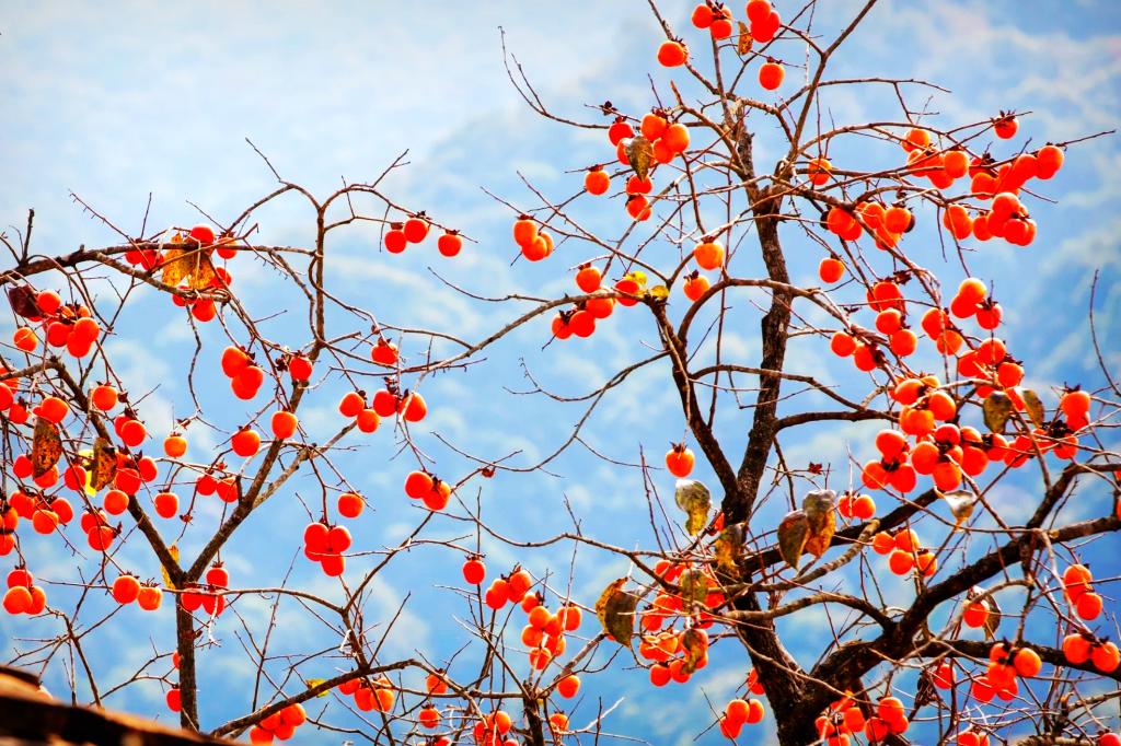 在山那頭,柿樹林依舊漫山遍野的紅,那一片片柿葉仿佛從天空墜下的紅霞綴滿樹冠,那一樹樹掛滿枝頭的柿子猶如燃燒的火球,它們好像等不及似的在樹上你用我擠?;鸺t的風(fēng)采浸染在了這片柿林,把柿林腳下的土地映襯得赤紅!柿樹裝扮著山前坡后,這是鄉(xiāng)村特有的秋韻,這是豐收的季節(jié)更是果農(nóng)們幸福的季節(jié)。