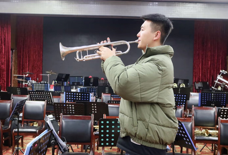 記得剛入職的第二周,史主席帶我到公司五樓樂器室親手將一把嶄新的小號交到我手中。那一刻,我興奮極了!我感受到的不僅是小號的重量,更是管樂藝術團老一輩人對藝術的尊重與傳承的責任感、使命感。那時的我,盡管對樂譜一無所知,但對音樂的世界充滿了好奇。我迫不及待地拿起那把嶄新的小號,可無論再怎么用力吹,就是沒反應。史主席耐心地說:“別急,首先你要知道如何使用它。”從此,我成為了銅煤職工管樂藝術團這個溫馨大家庭的一員,往后的每一天,我都跟樂團的同事一樣,拔長音、吹練習曲……