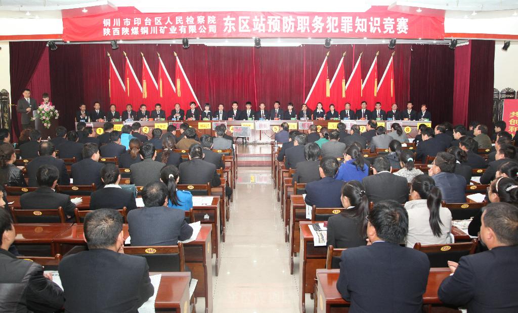 會后,印臺區(qū)檢察院、公司東區(qū)站在王石凹礦中心會議室舉辦了預防職務(wù)犯罪知識競賽。公司預防職務(wù)犯罪東區(qū)站成員單位玉華礦、東坡礦、金華山礦、王石凹礦、徐家溝公司、鴨口公司、一五三廠以及東坡洗煤廠共八只代表隊參加了比賽。公司黨委書記王蓬,黨委副書記、紀委書記徐捷,紀委副書記王發(fā)明,銅川市人民檢察院副檢察長杜建成,印臺區(qū)、王益區(qū)、耀州區(qū)檢察院領(lǐng)導,公司各部門相關(guān)領(lǐng)導以及王石凹礦干部職工共200余人觀看了比賽。